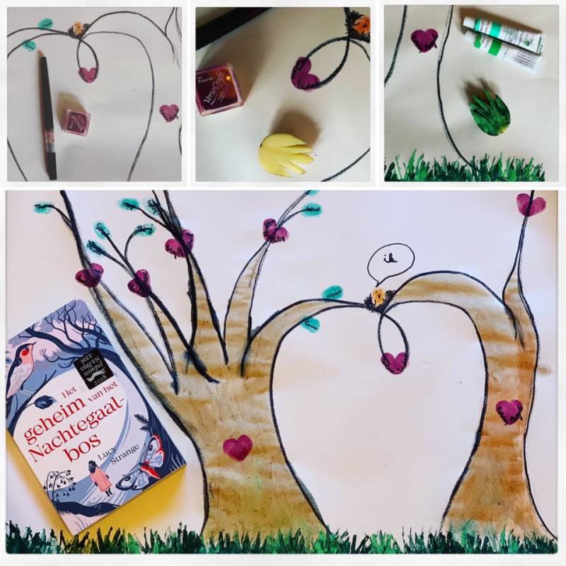 Teken/schilder 2 bomen (één voor elke ouder) met takken. Op de boomstam komen twee rode duimafdrukken met daarin de naam van de grootouders. Aan het einde van de takken die naar binnen toe een hartje vormen, komen de duimafdrukken van de ouders. Met op de kruisende takjes daarboven een nestje met de kinderen. De andere takken representeren tantes en nonkels (ook telkens 2 duimen die hartjes maken) met daarboven de twijgen met groene vingerafdrukken van neven en nichtjes.